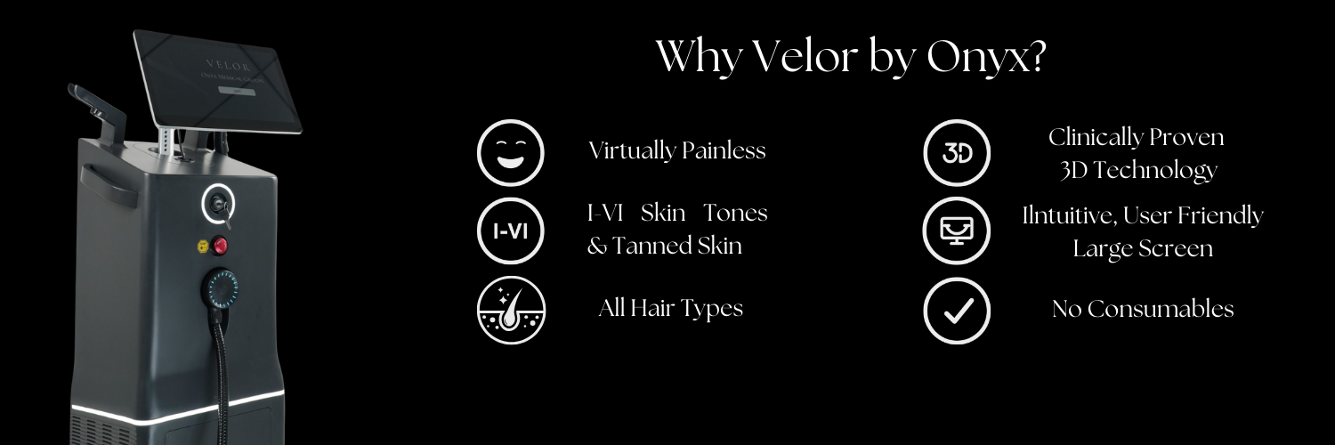 Experience the future of laser hair removal with Onyx’s cutting-edge technology Velor, engineered for superior precision and effectiveness. Our innovative system seamlessly integrates three powerful wavelengths in a single applicator, penetrating multiple tissue depths to target hair follicles with maximum efficiency.